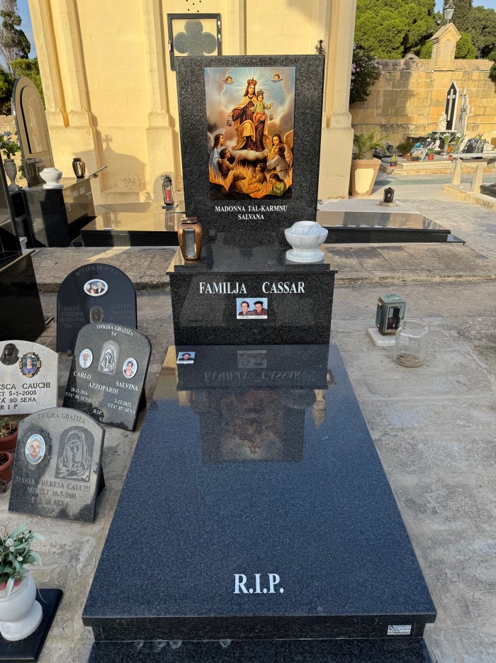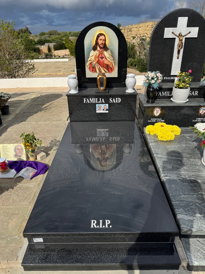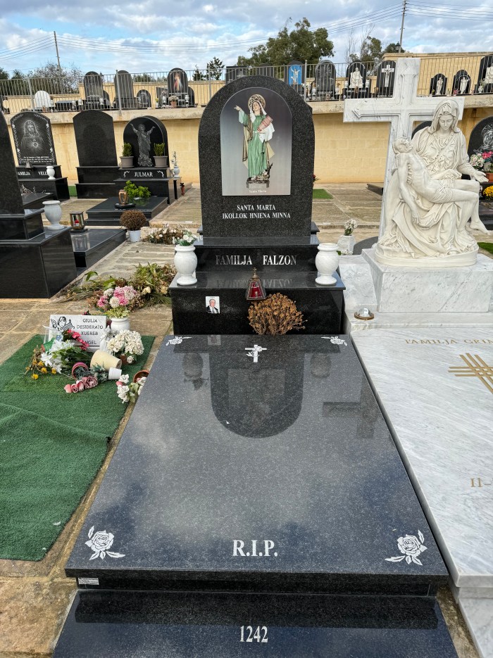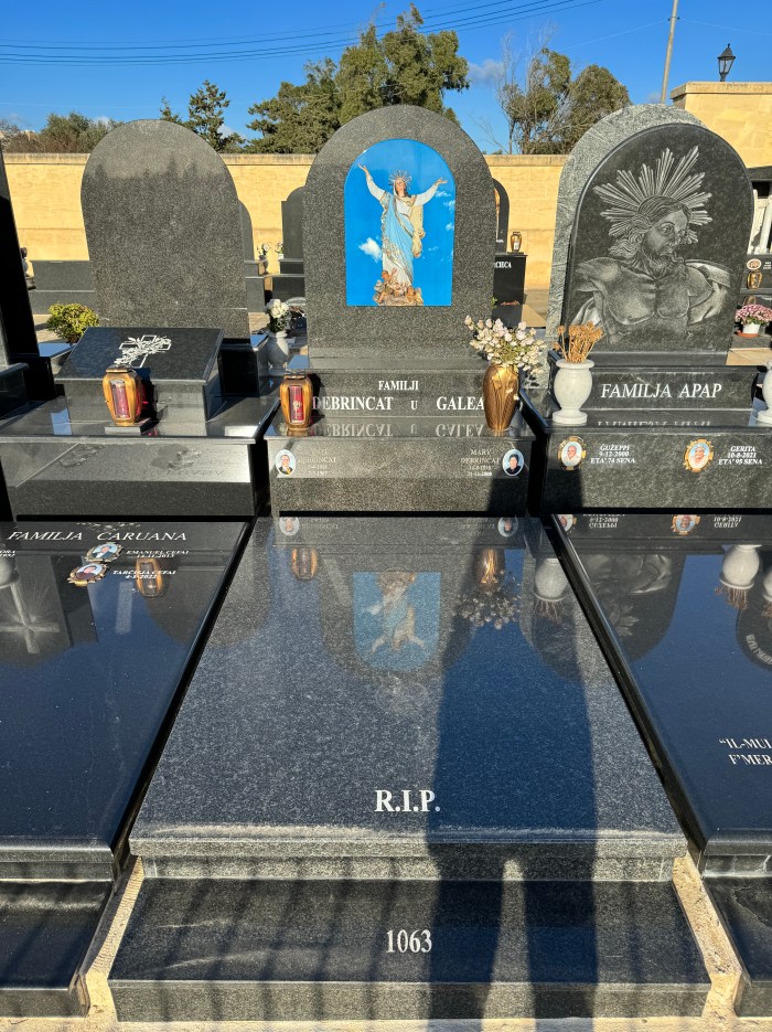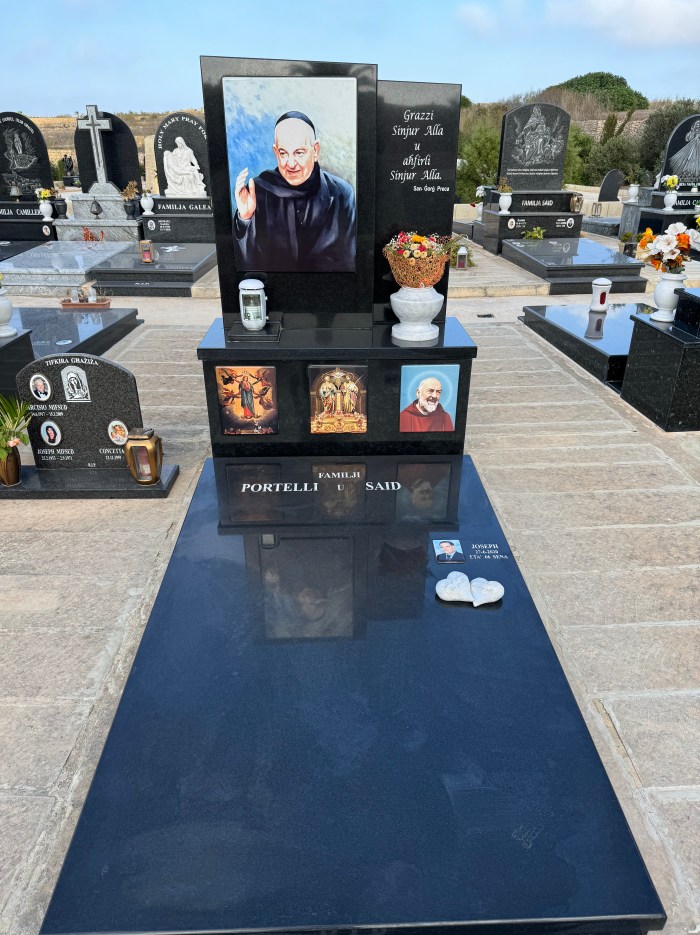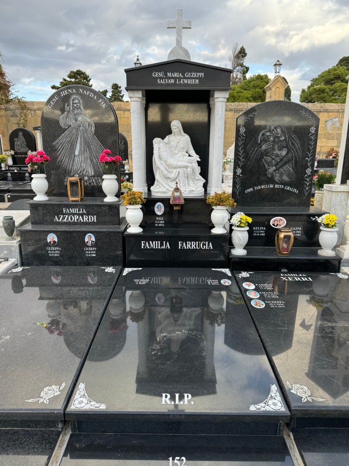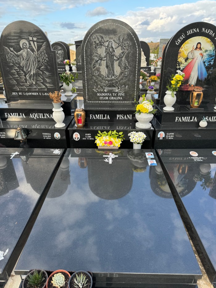 Cemetry Memorial in Nero Assoluto Granite with Photo Ceramic (San Gorg Preca, Madonna Ta’ Pinu, San Pietru Pawl u Padre Pio)