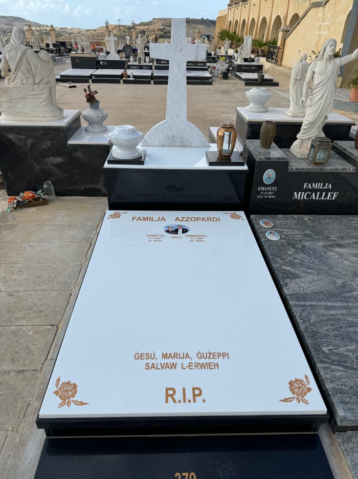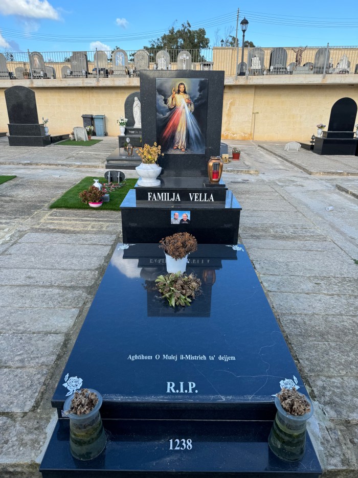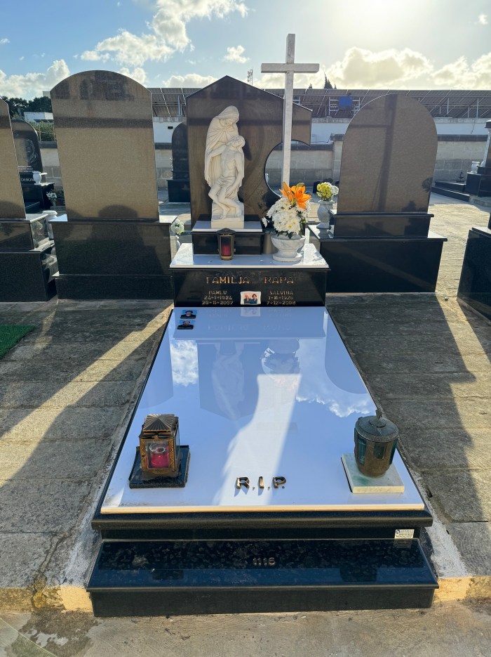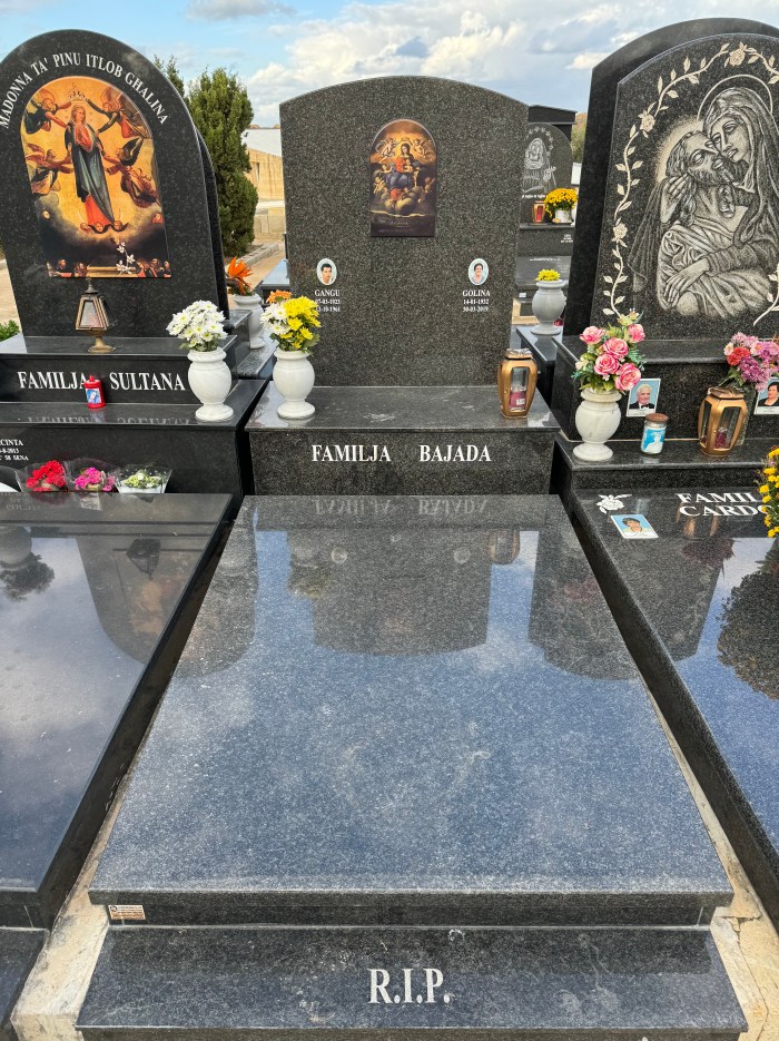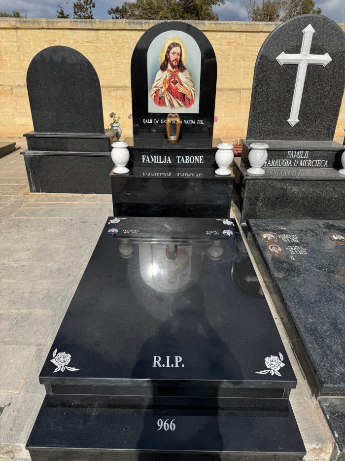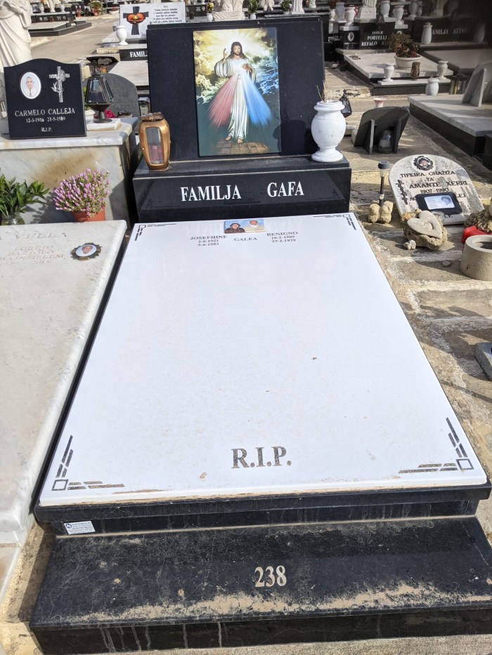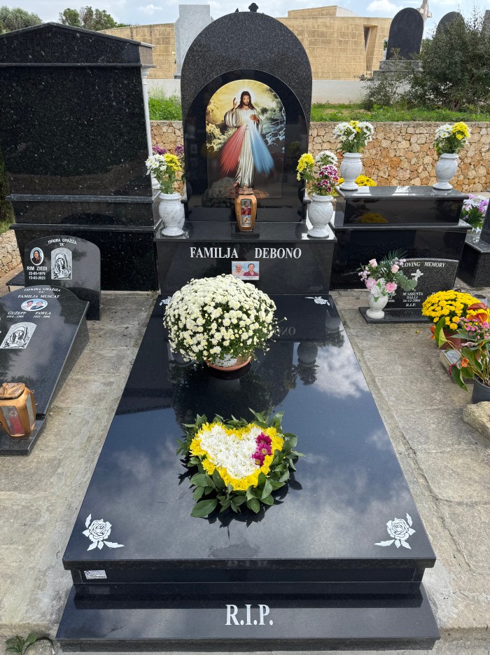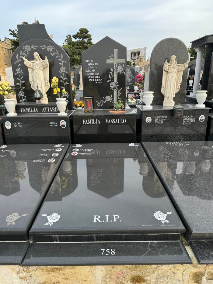 Cemetry Memorial in Nero Assoluto Granite with Photo Ceramic (San Gorg Preca, Madonna Ta’ Pinu, San Pietru Pawl u Padre Pio)
